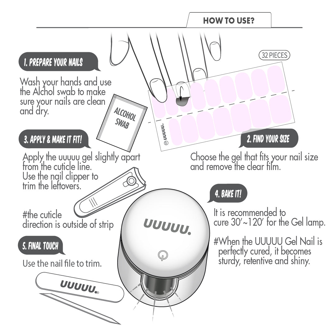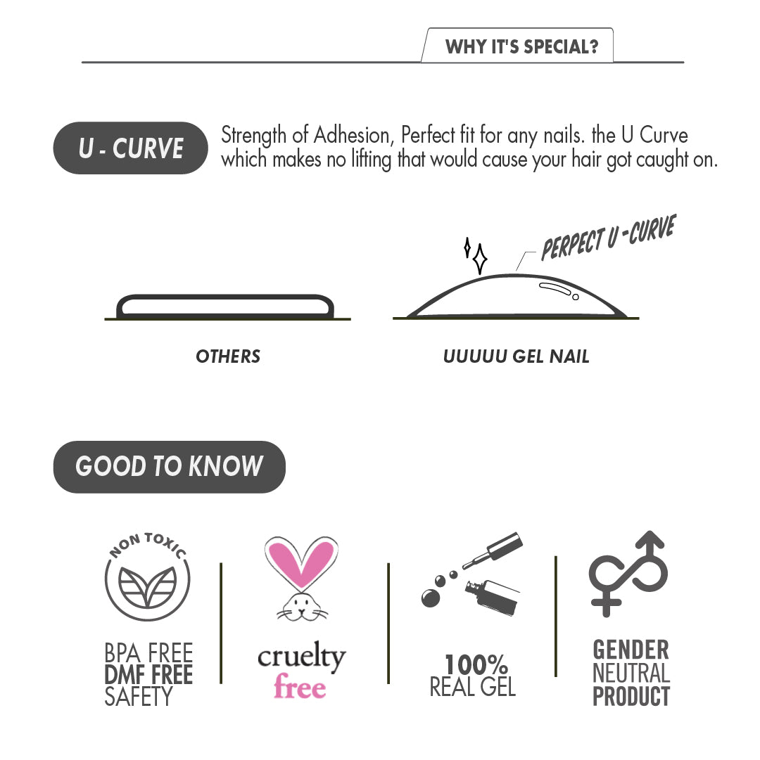 * Sweat, moisture, hand cream, oil on your nails can reduce adhesion of the UUUUU Gel nail.