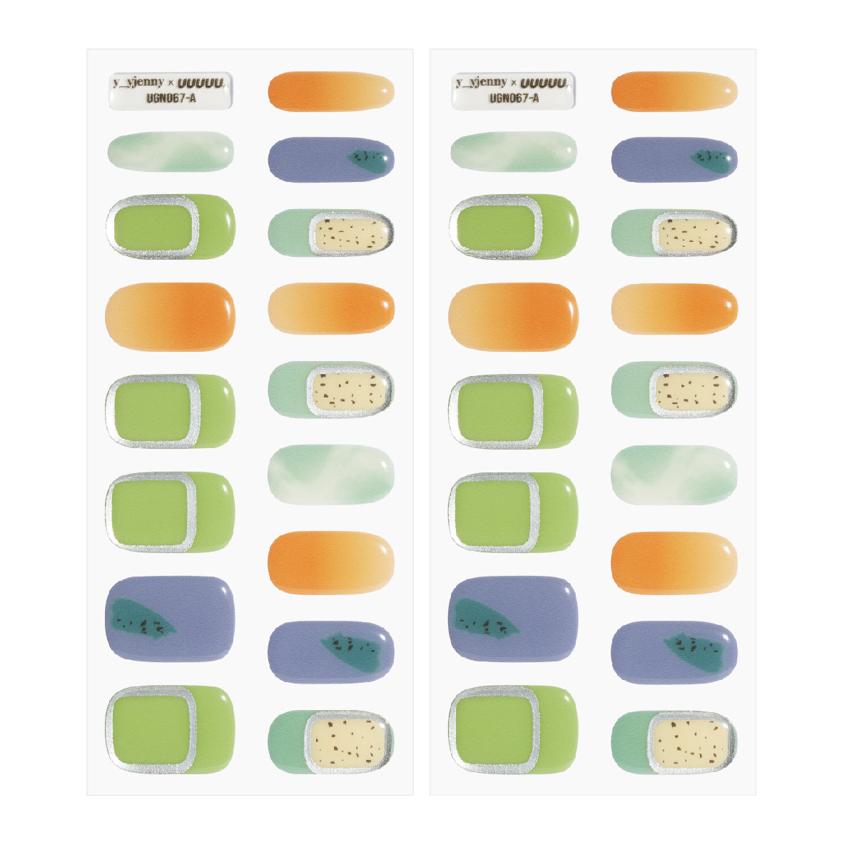 This vibrant multicolor set features a bold mix of green, blue, orange, and nude nails, designed to make sure you’re always the center of attention.
